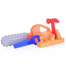 В наборе: бензопила, рубанок, молоток, ножовка. Материал: пластик. Соответствует требованиям безопасности продукции.