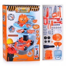 В наборе: гаечный ключ, плоскогубцы, тиски, разводной ключ, отвертка, пила, молоток, элементы конструктора, защитные очки, каска, верстак 51х29х71 см. Материал: пластик. Соответствует требованиям безопасности продукции.