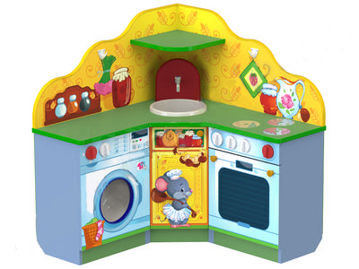 Кухня «Мальвина» малая. Выполнена из ламинированной ДСП (ЛДСП) 16 мм, обрамлена кантом ПВХ 2 мм, все углы закруглены. Более компактное воплощение нашей самой популярной кухни «Мальвина«. Эту компактную угловую кухню удобно расположить в небольших игровых комнатах или даже дома. Цвет на выбор. Возможно изготовление с фотопечатью.