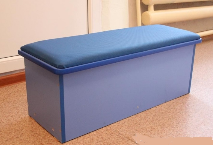 Банкетка выполнена из ламинированного ДСП (ЛДСП) толщиной 16 мм, сиденье обрамлено врезным кантом 2 мм, корпус скамейки кромка ПВХ 0,4 мм. Сиденье обивка - винилискожа на основе хлопкового трикотажа с прослойкой из поролона. Данный материал обладает отличной эластичностью и хорошей износостойкостью. Каркас банкетки представляет собой вместительный ящик, что позволяет хранить там различные вещи, одежду, пособия, сиденье-крышка поднимается при помощи петель. Мягкая обивка создает более комфотные условия для детей. Цвет на выбор - http://ptkraduga.ru/katalog/cvetovaya-palitra-ldsp.html