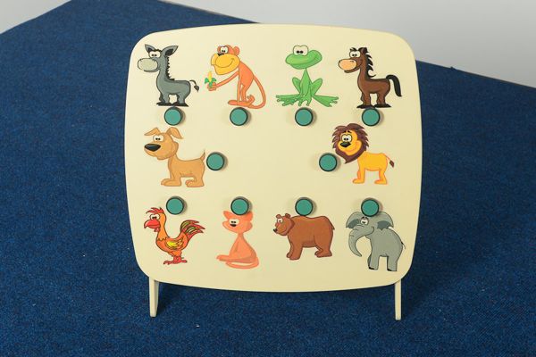 В панель вмонтированы 10 кнопок с 10 звуками - петух, лев, обезьяна, осел, кот, собака, слон, лягушка, лошадь, медведь.
